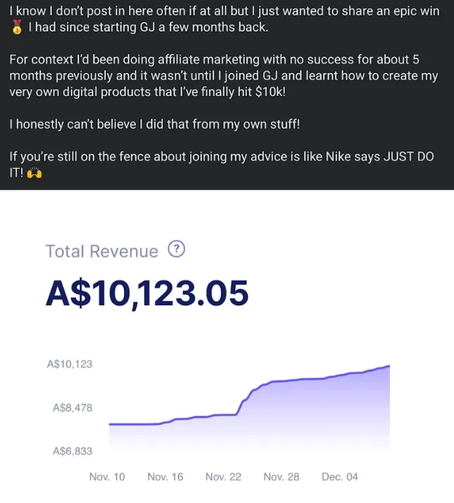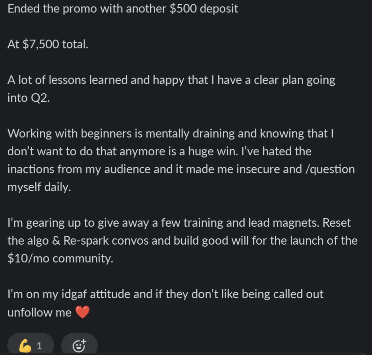 "In the last 100 days since launching the offer to my community of less than 900 poeple has offically crossed the $100k mark."